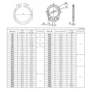 Our External Circlips, conforming to DIN471 and IS3075-1 standards, are crafted from high-quality AISI 1070 / 70 C Spring Steel, ensuring durability and reliability. Designed for securing components on shafts, they are available in a wide range of sizes from 4mm to 150mm. These circlips feature a uniform chemical composition, making them ideal for a variety of industrial applications. Their robust design ensures a secure fit, preventing lateral movement and offering excellent retention capability.